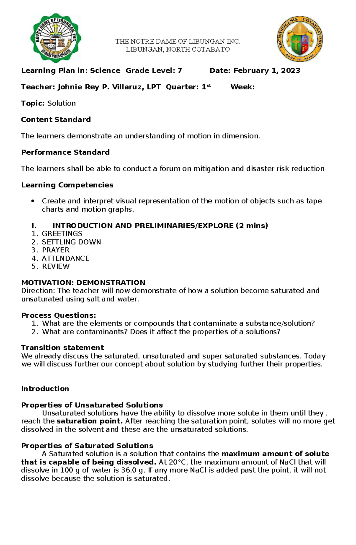 Learning Plan: Science Grade 7 - Solutions & Their Properties (LPG7 ...