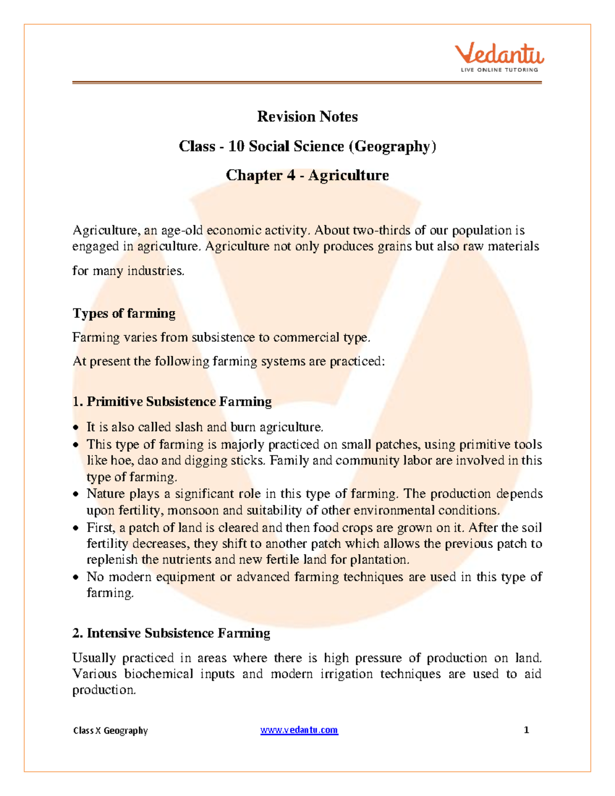 Agriculture Class 10 Social Science Notes Set 1 PDF