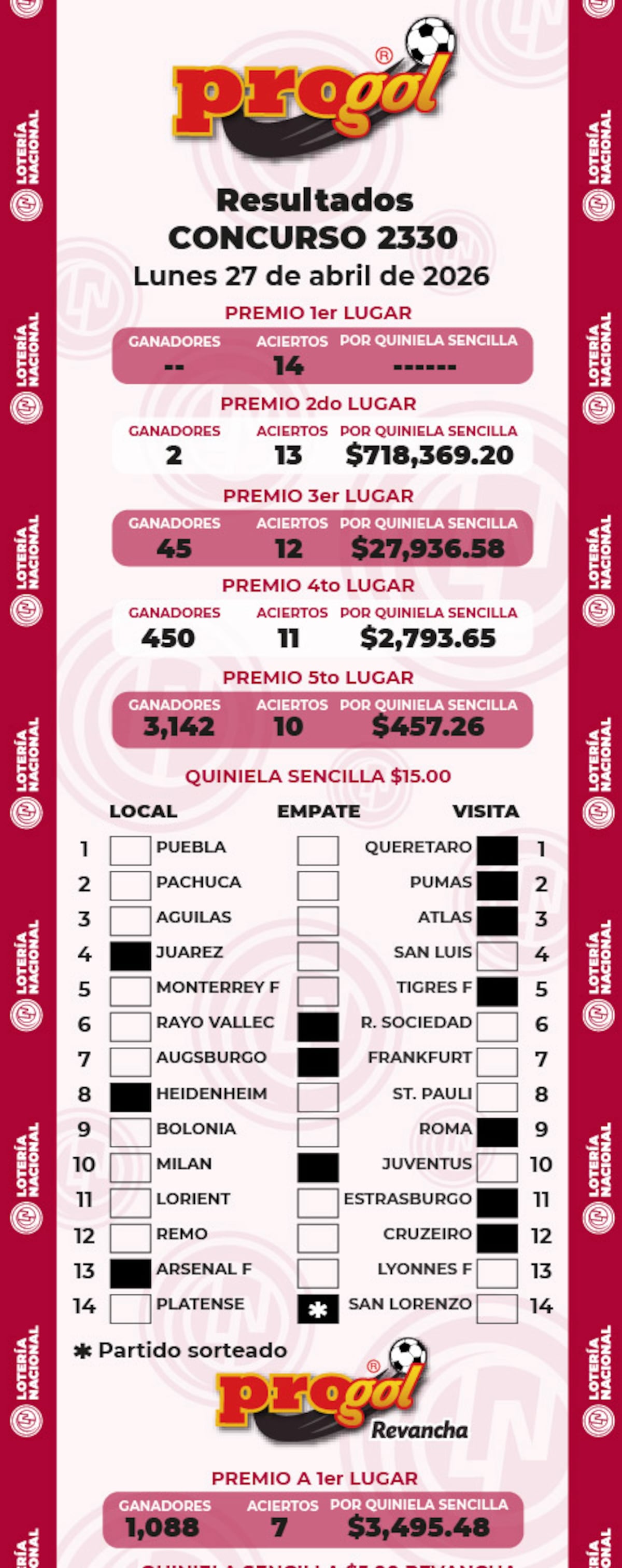 Resultados Quiniela Progol 2330: premios de la quiniela ganadora del 27 ...