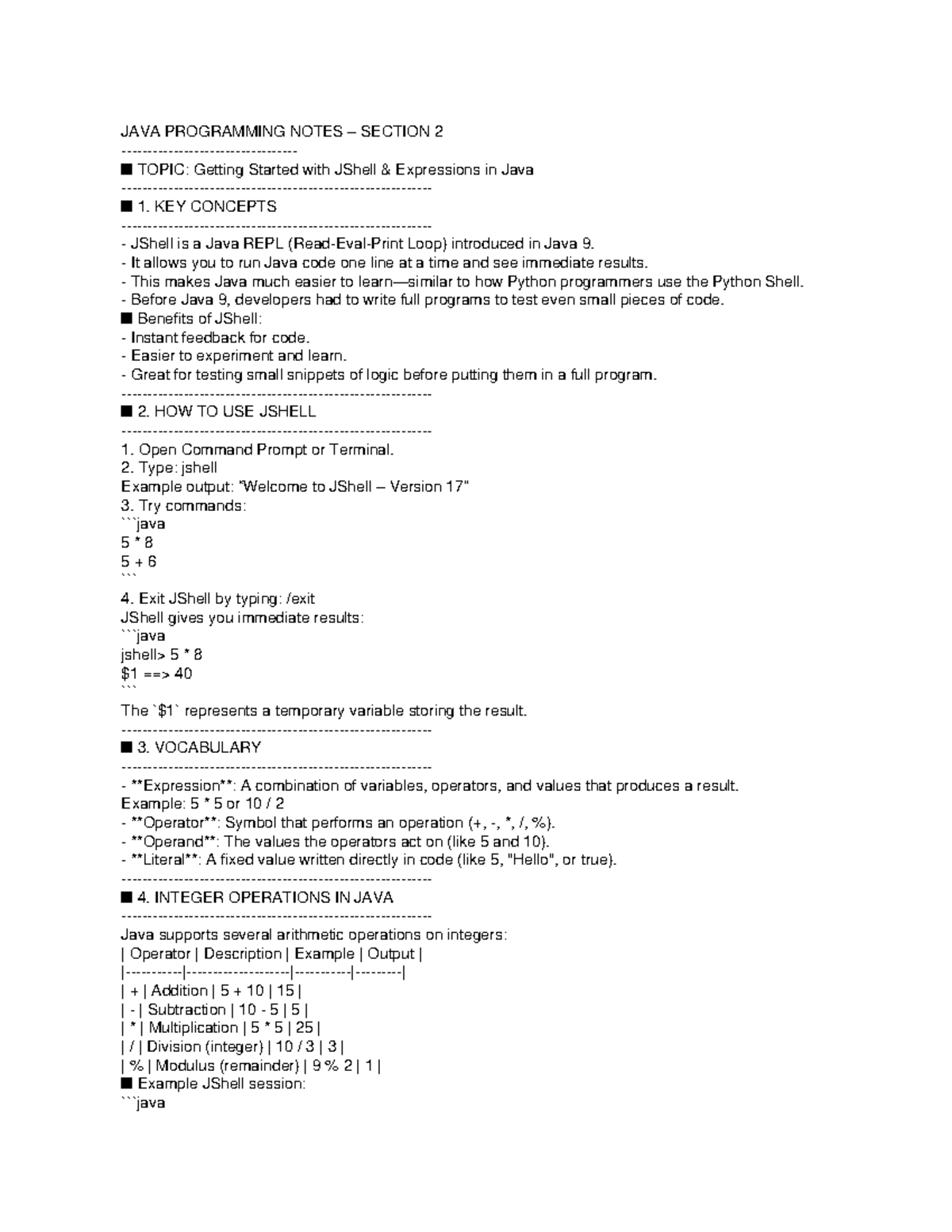 Java Programming Notes: Getting Started with JShell (Section 2) - Studocu