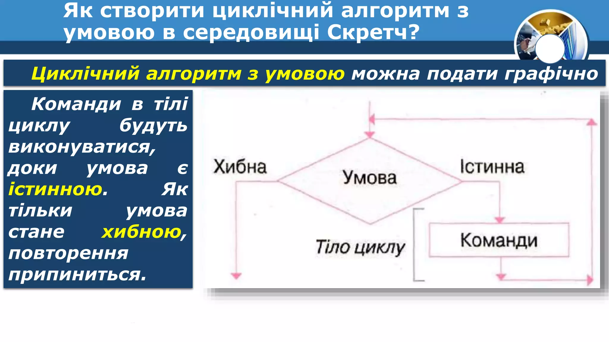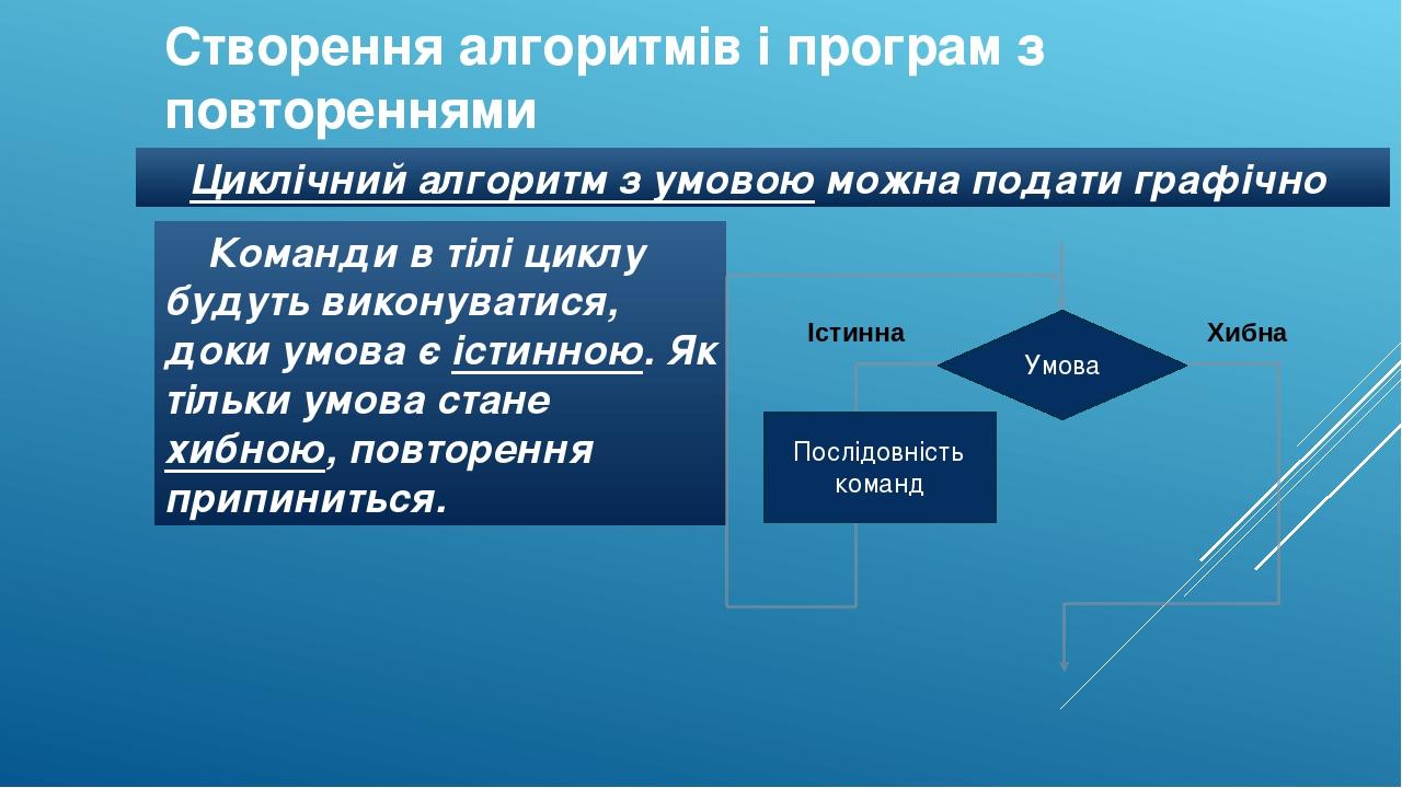 Based on this image's title: “Презентація "Алгоритми з повтореннями. Цикл з передумовою"”
