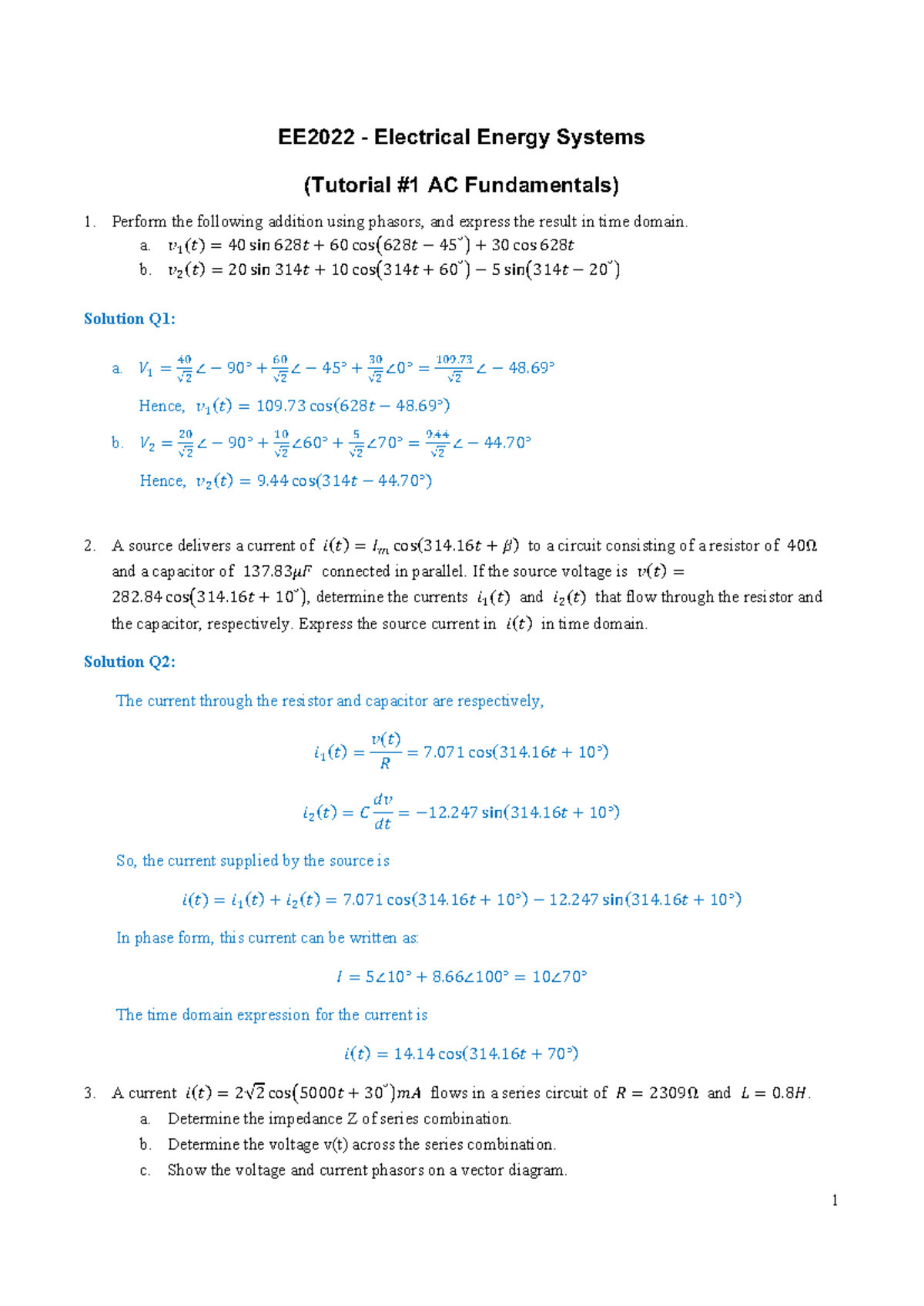 EE2022 Electrical Energy Systems (Tutorials 1-3 for Test 1) - Studocu