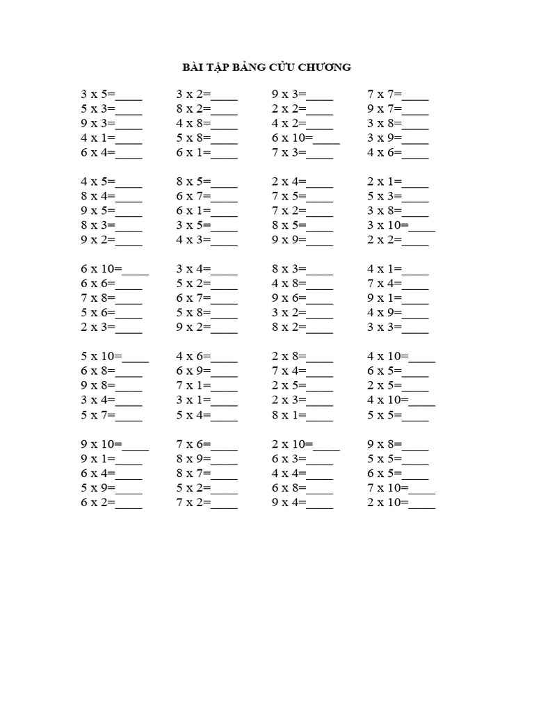 BÀI TẬP BẢNG CỬU CHƯƠNG | PDF