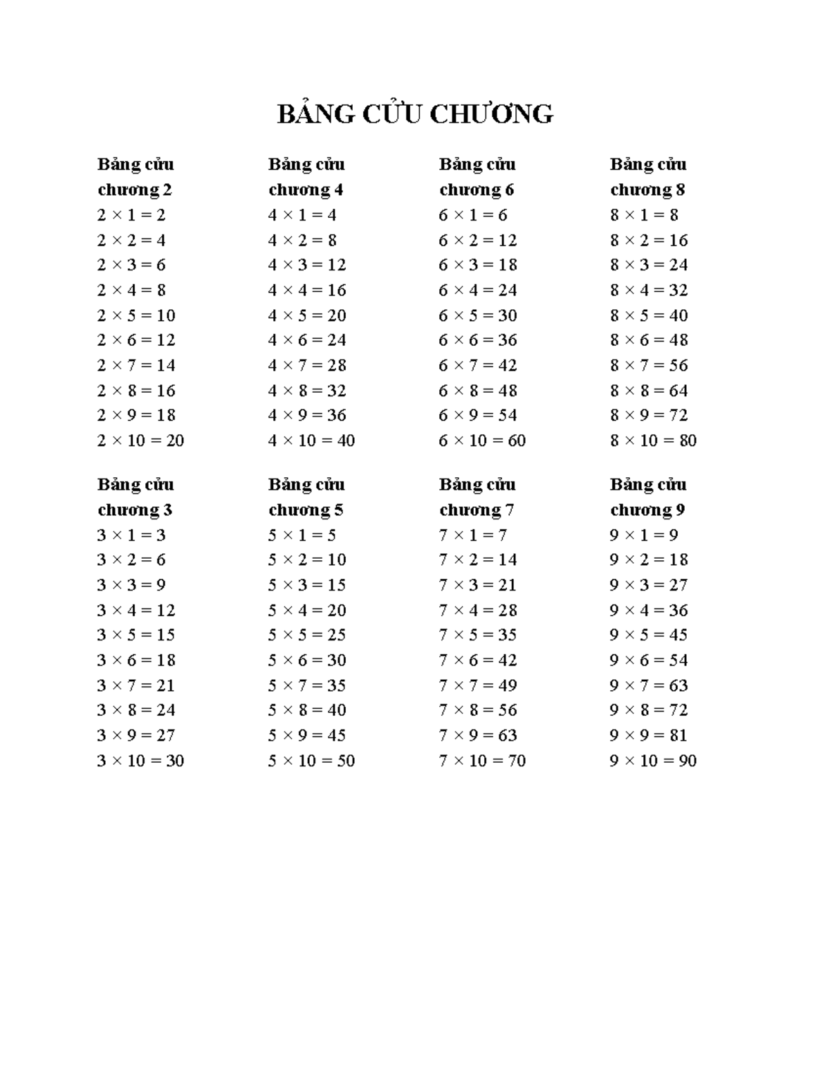 BẢNG CỬU CHƯƠNG TOÁN HỌC - TỔNG HỢP CÁC BẢNG 2 ĐẾN 10 - Studocu