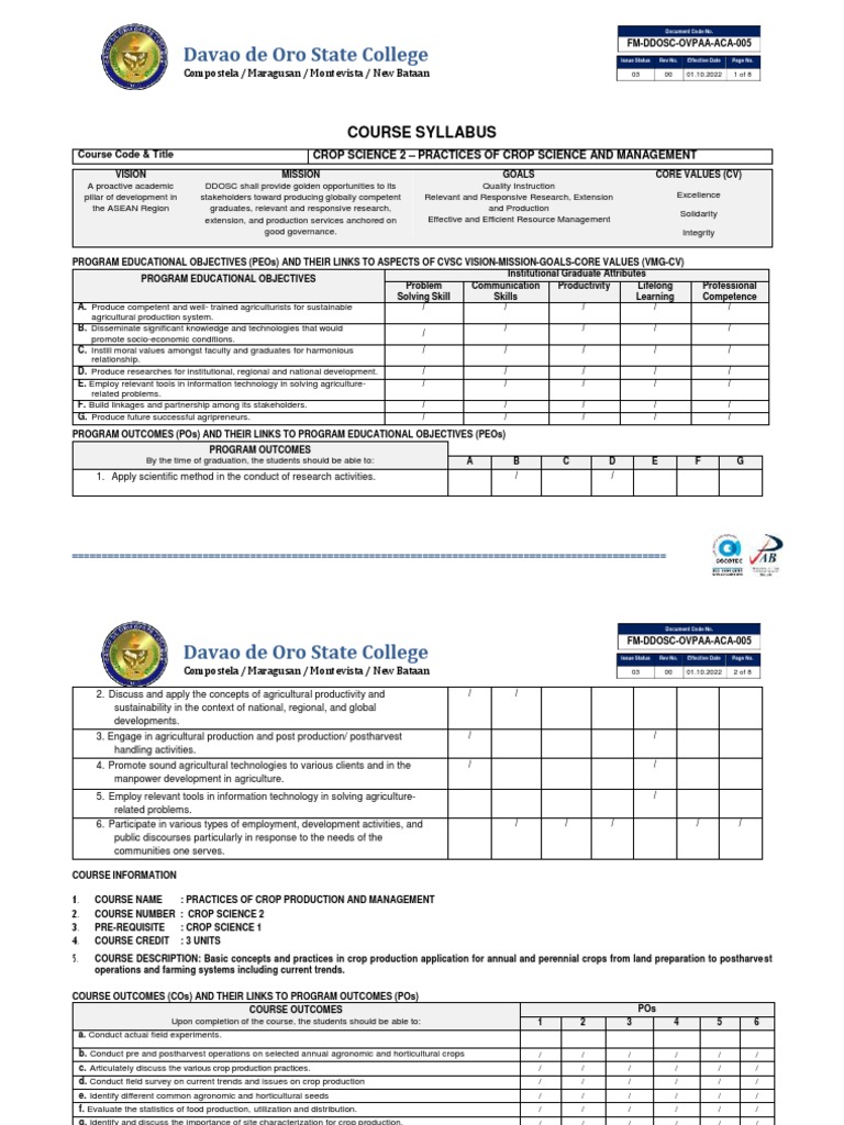 CROP SCI 2 - Course Syllabus SY 2022 2023 - 2nd Sem - 1st Draft | PDF