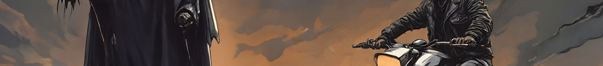 Three sinister riders on motorcycles under a foreboding night sky ...