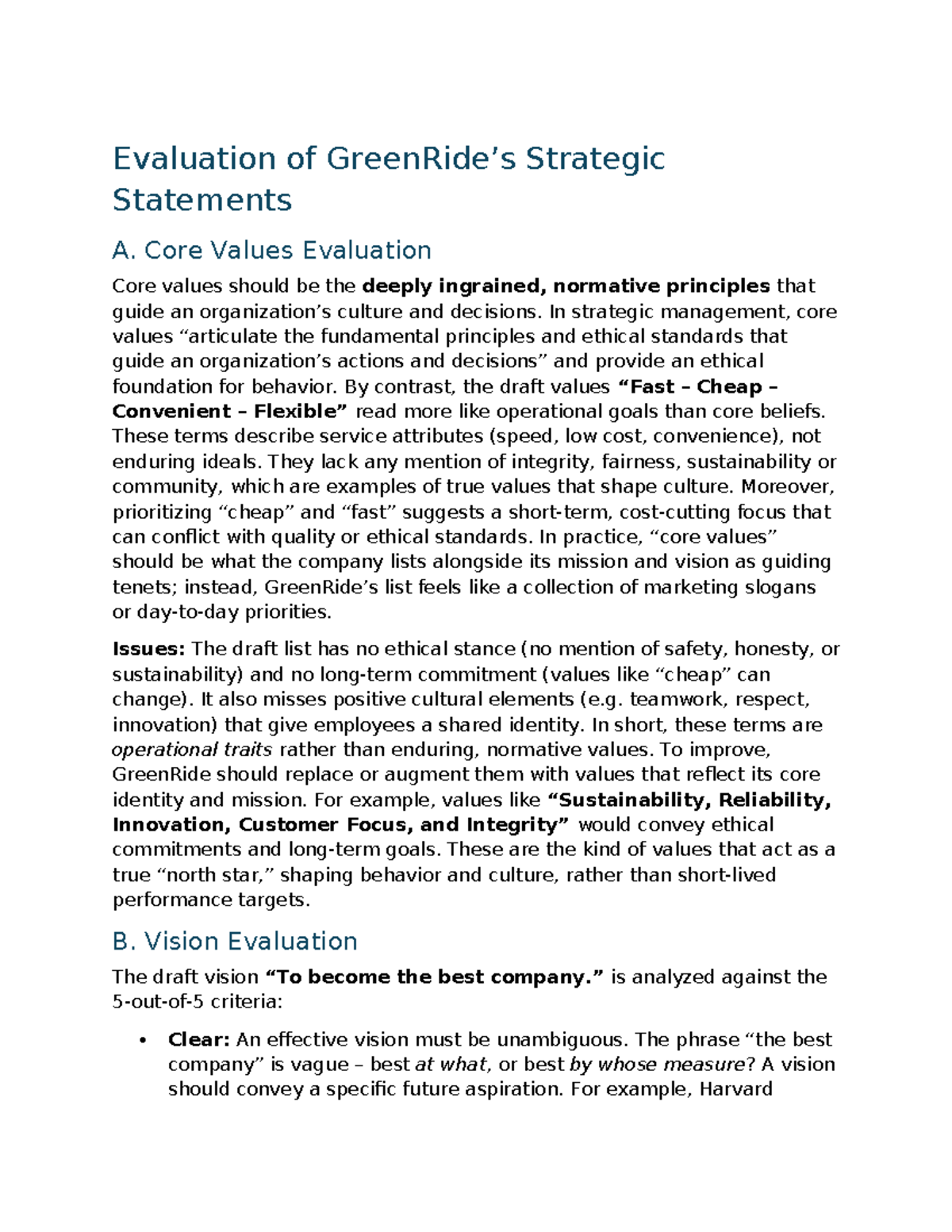 Evaluation of Strategic Statements: Core Values, Vision, and Mission ...