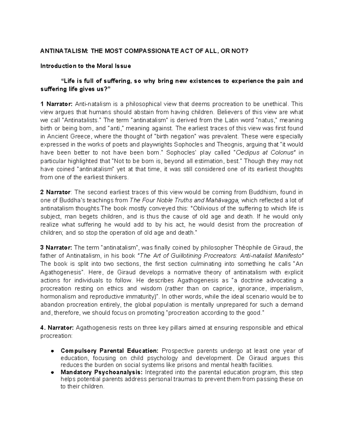ANTINATALISM: ETHICAL DILEMMAS & MORAL ARGUMENTS - FINAL PROJECT - Studocu