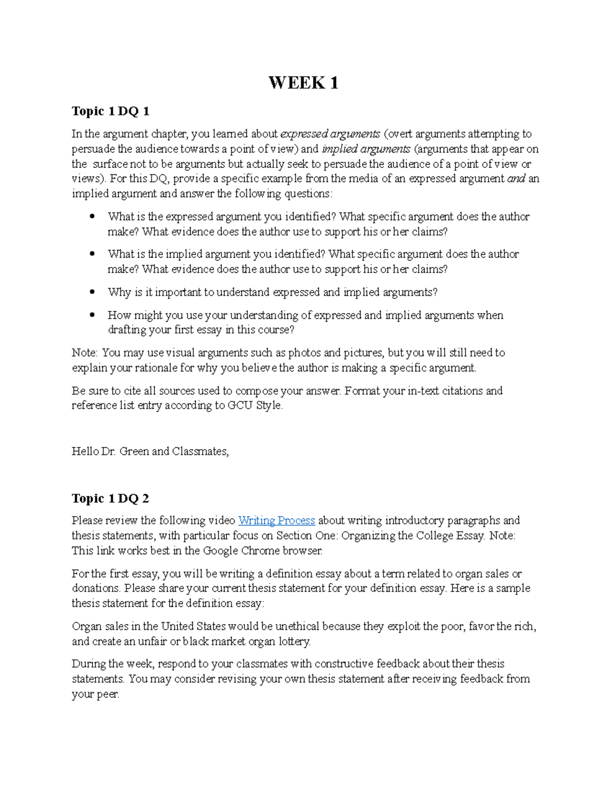 WEEK 1 DQs - Expressed & Implied Arguments + Thesis Statement Feedback ...
