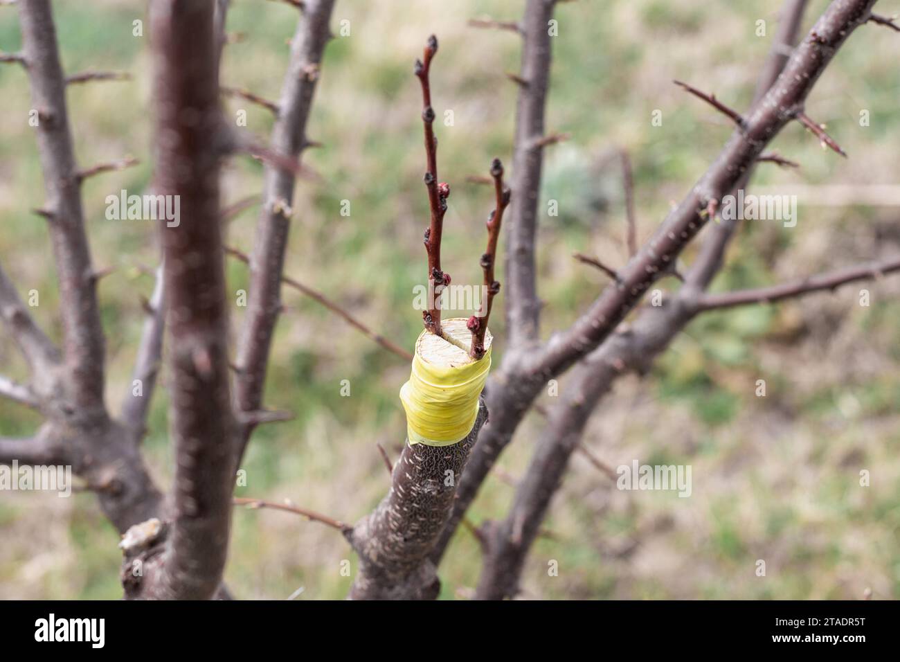 A gardener grafts a fruit tree using the split method Stock Photo - Alamy
