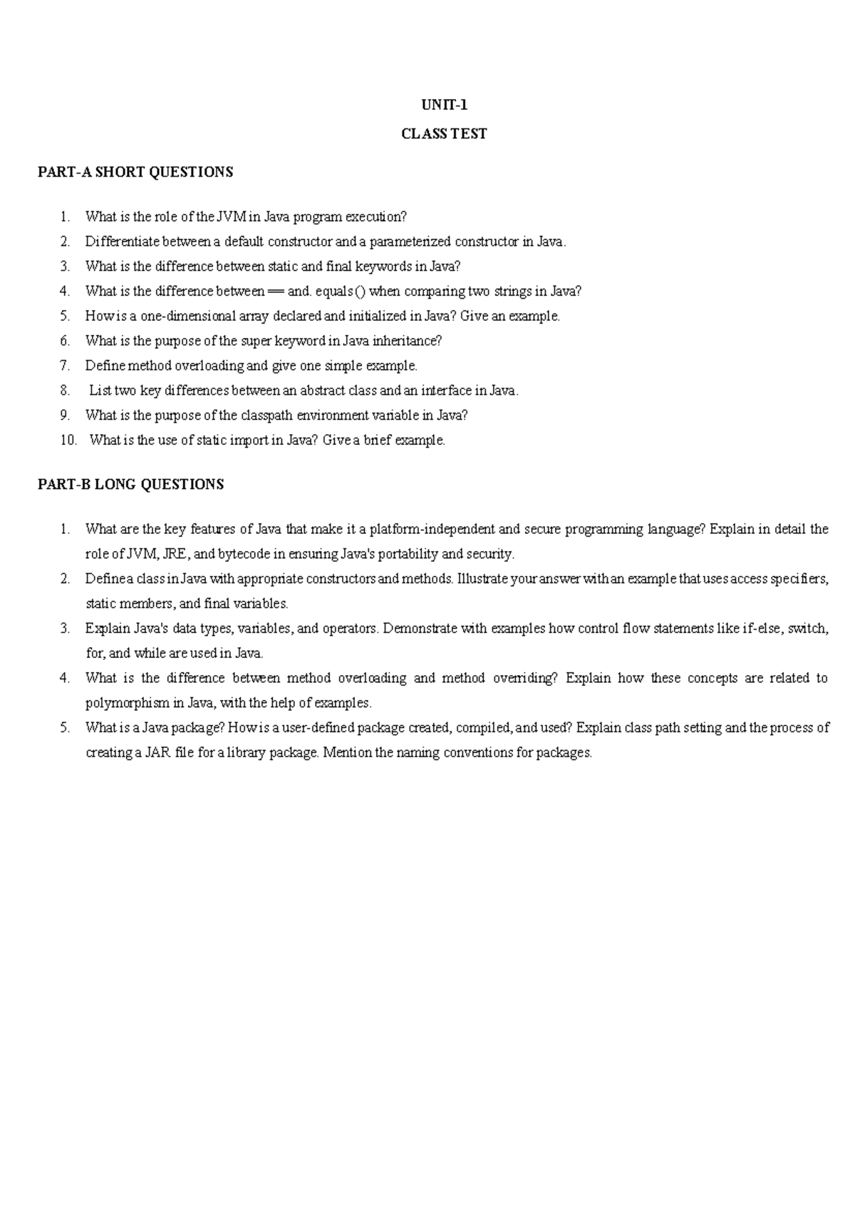 Java UNIT1 Class Test: Short & Long Questions Overview - Studocu