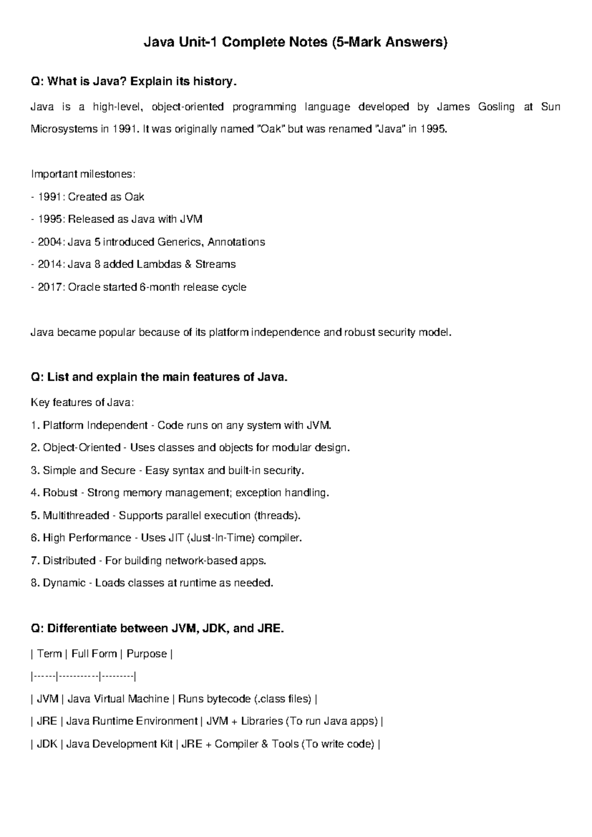Java unit1 Part A - good notes - The principles for creating Java ...