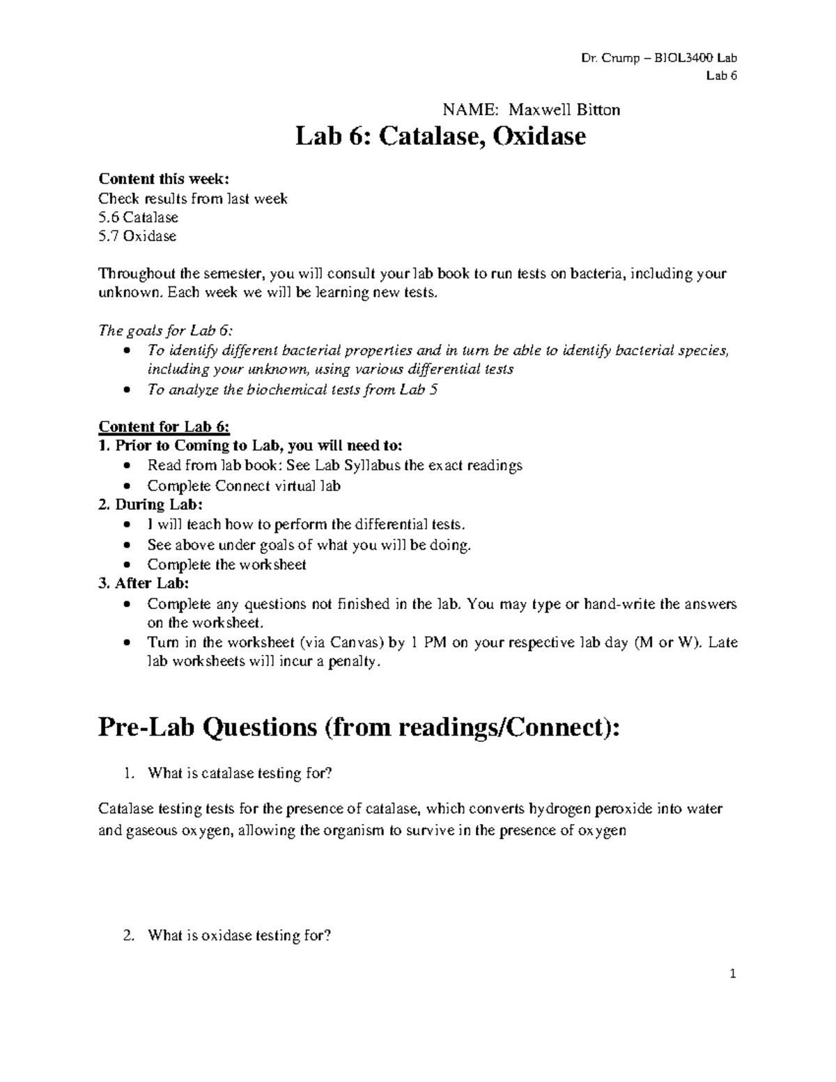 Lab 6-Catalase-Oxidase - Lab 6 NAME: Maxwell Bitton Lab 6: Catalase ...