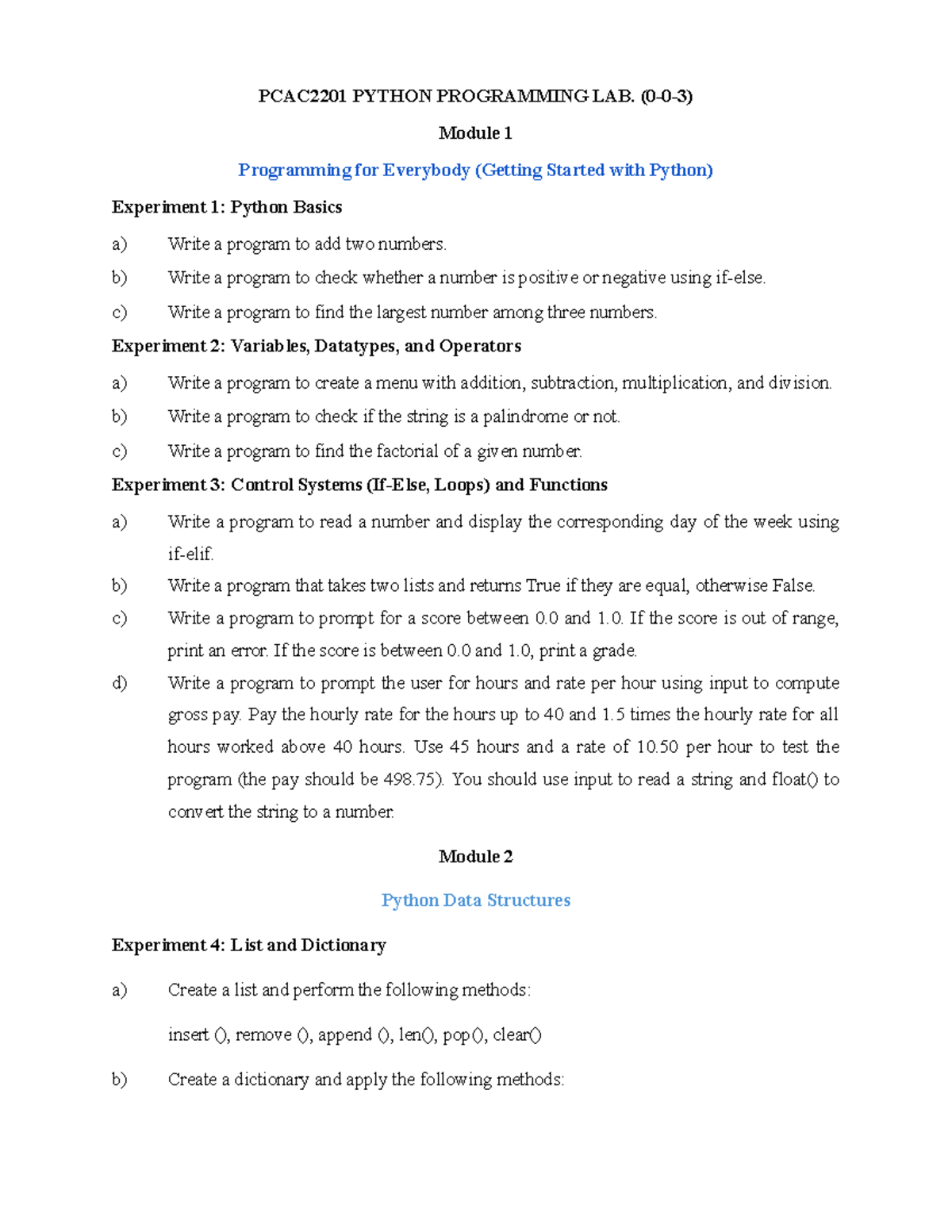 PCAC2201 PYTHON PROGRAMMING LAB: Experiments on Basics & Data ...