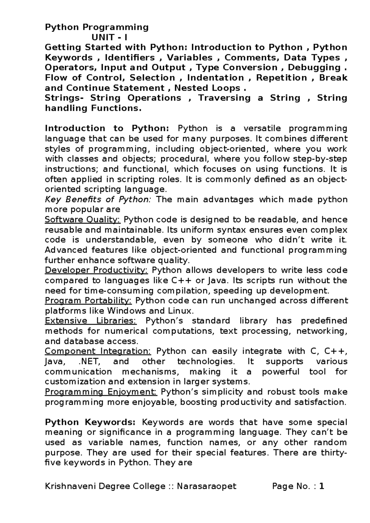UNIT-I PP-BCA - Introduction to Python Programming Concepts and ...