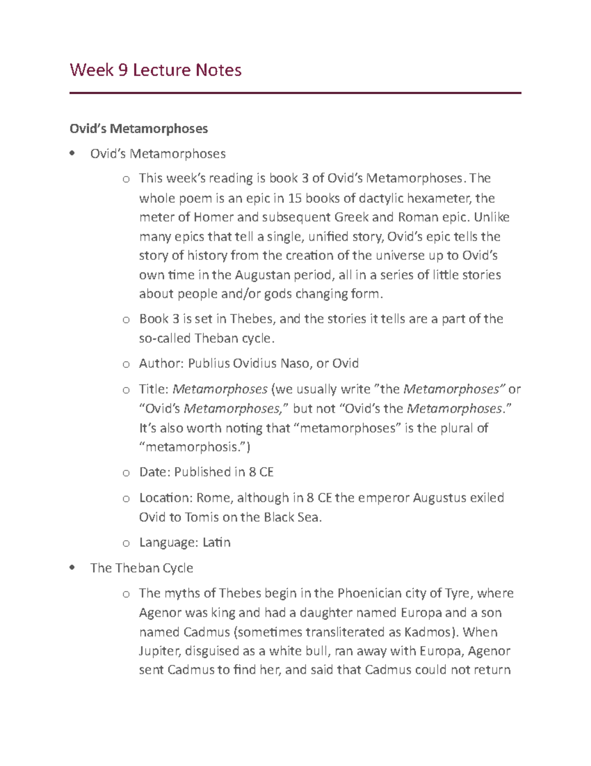 Week 9 Lecture Notes - Week 9 Lecture Notes Ovid’s Metamorphoses Ovid’s ...