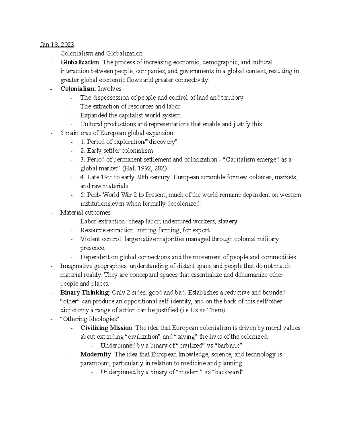 GGR112 Lecture Notes - Jan 18, 2023 - Colonialism and Globalization ...