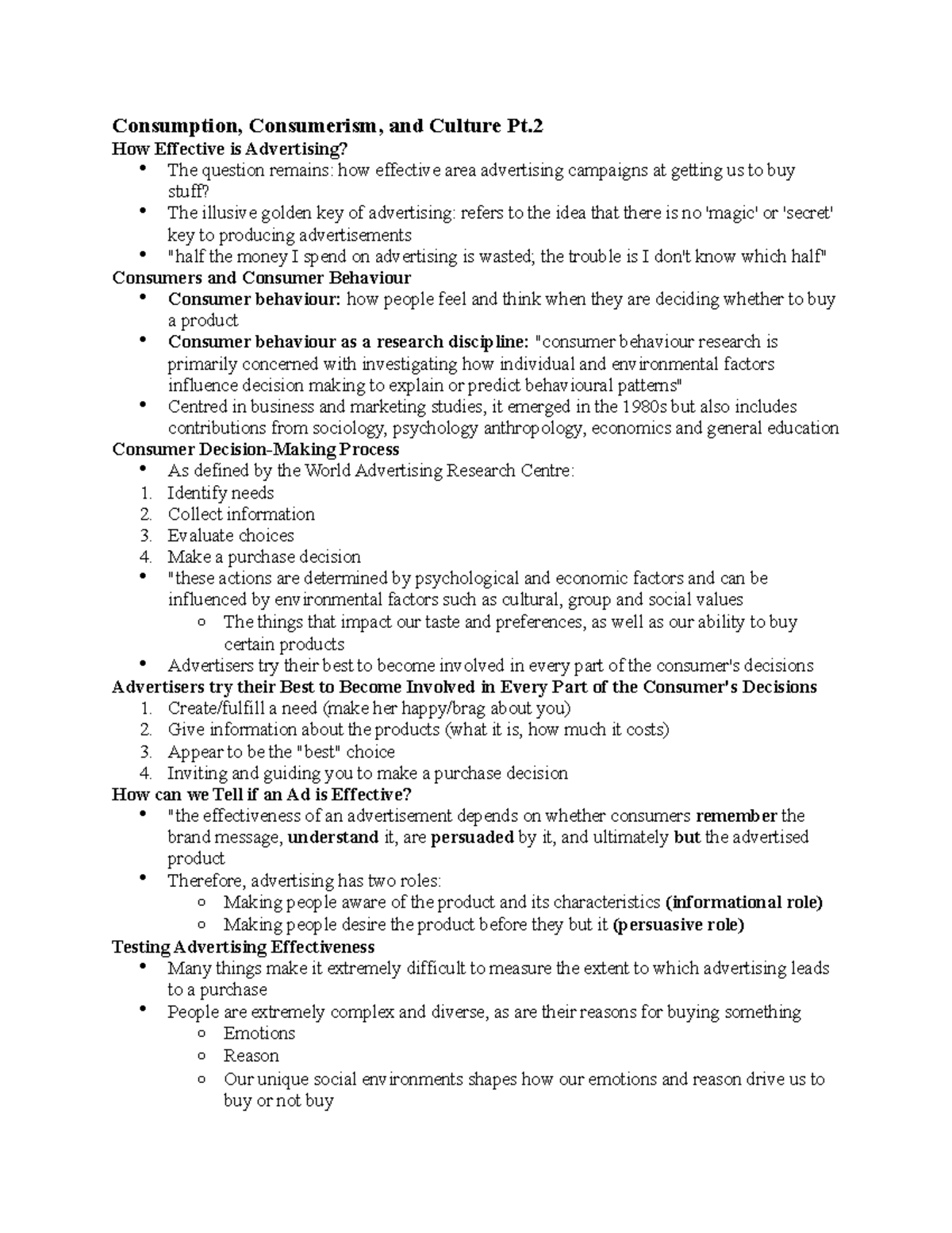 2172 Week 9 - Week 9 lecture notes - Consumption, Consumerism, and ...