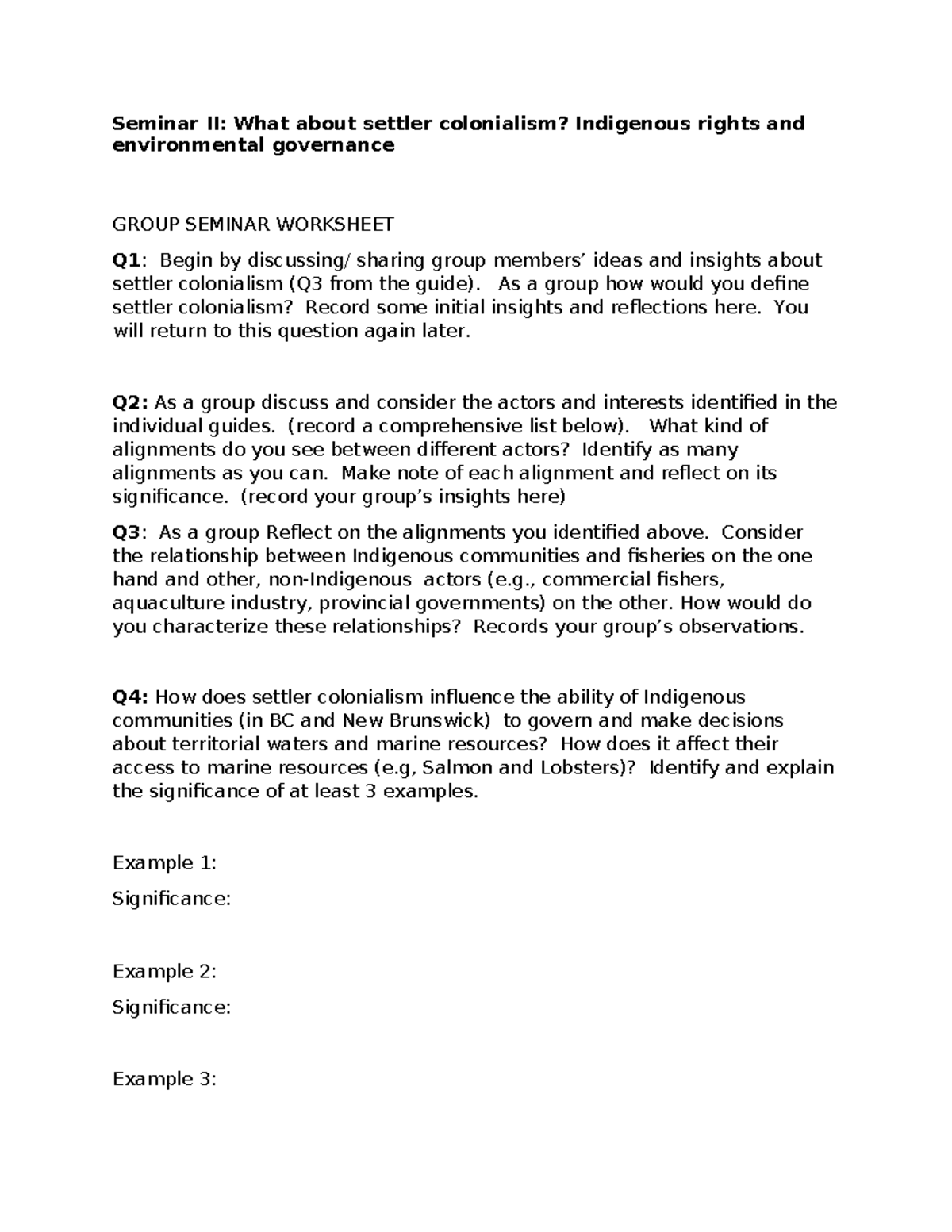 Seminar II Worksheet - Seminar II: What about settler colonialism ...