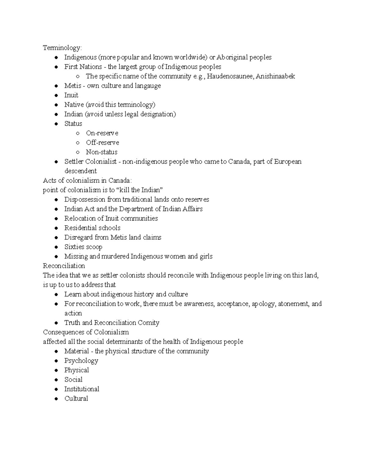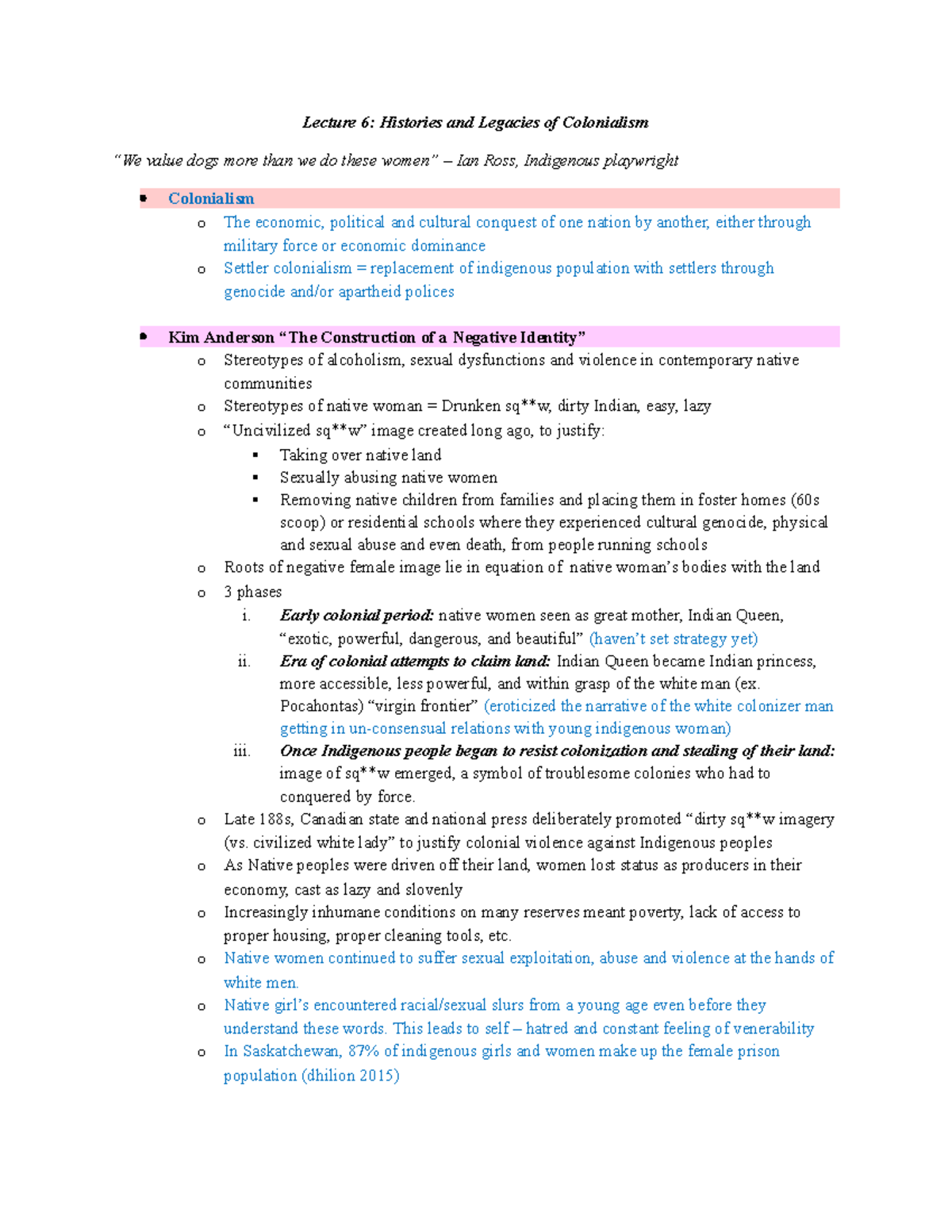 Lecture 6 Notes - WEEK 6: COLONIALISM AND THE HEALTH OF INDIGENOUS ...