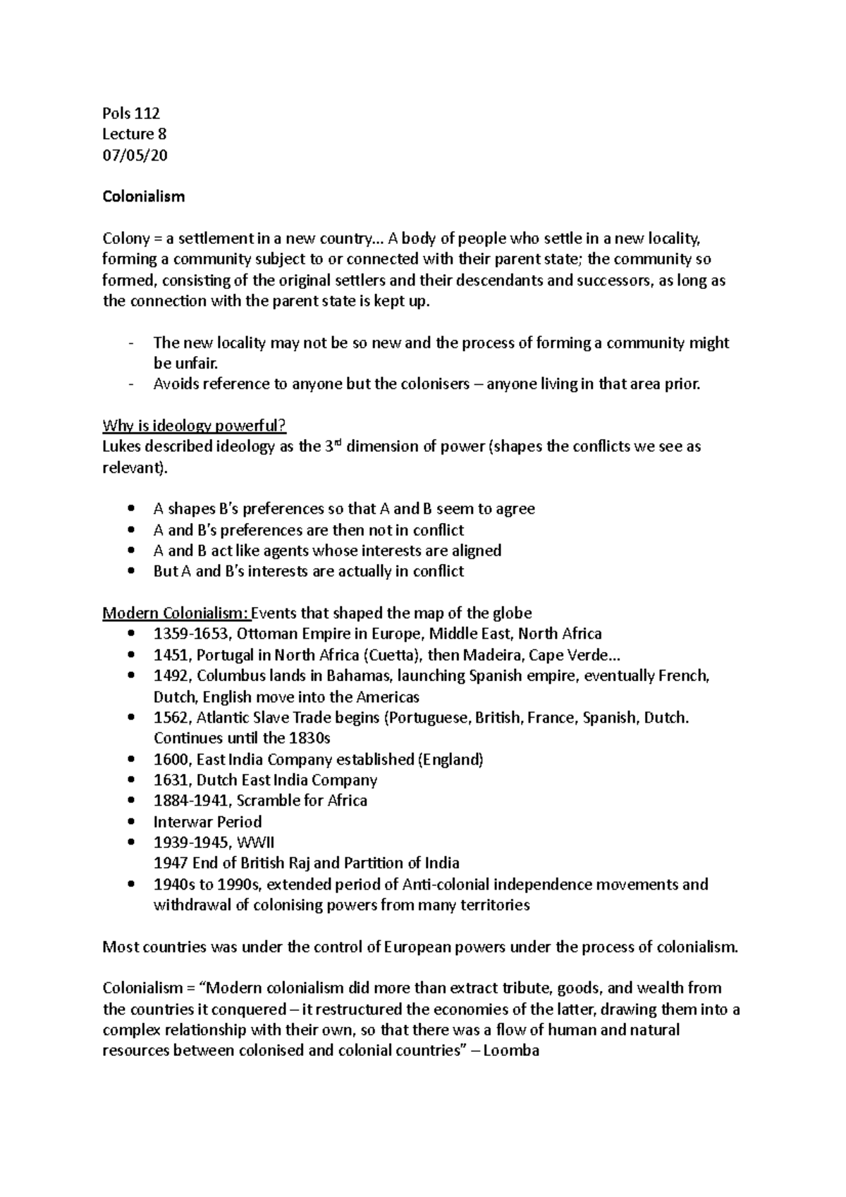 Govt1621 l8 - lecture 8 notes - What is colonialism? Refers ...