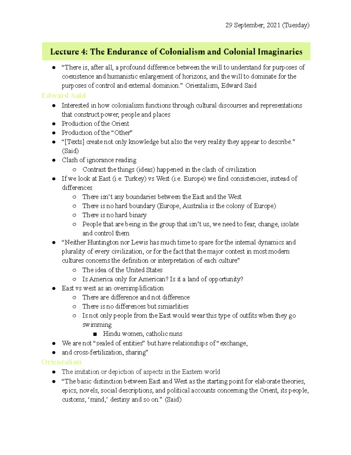 Lecture 4 - Post colonialism and orientalism - Lecture 4 – Colonialism ...