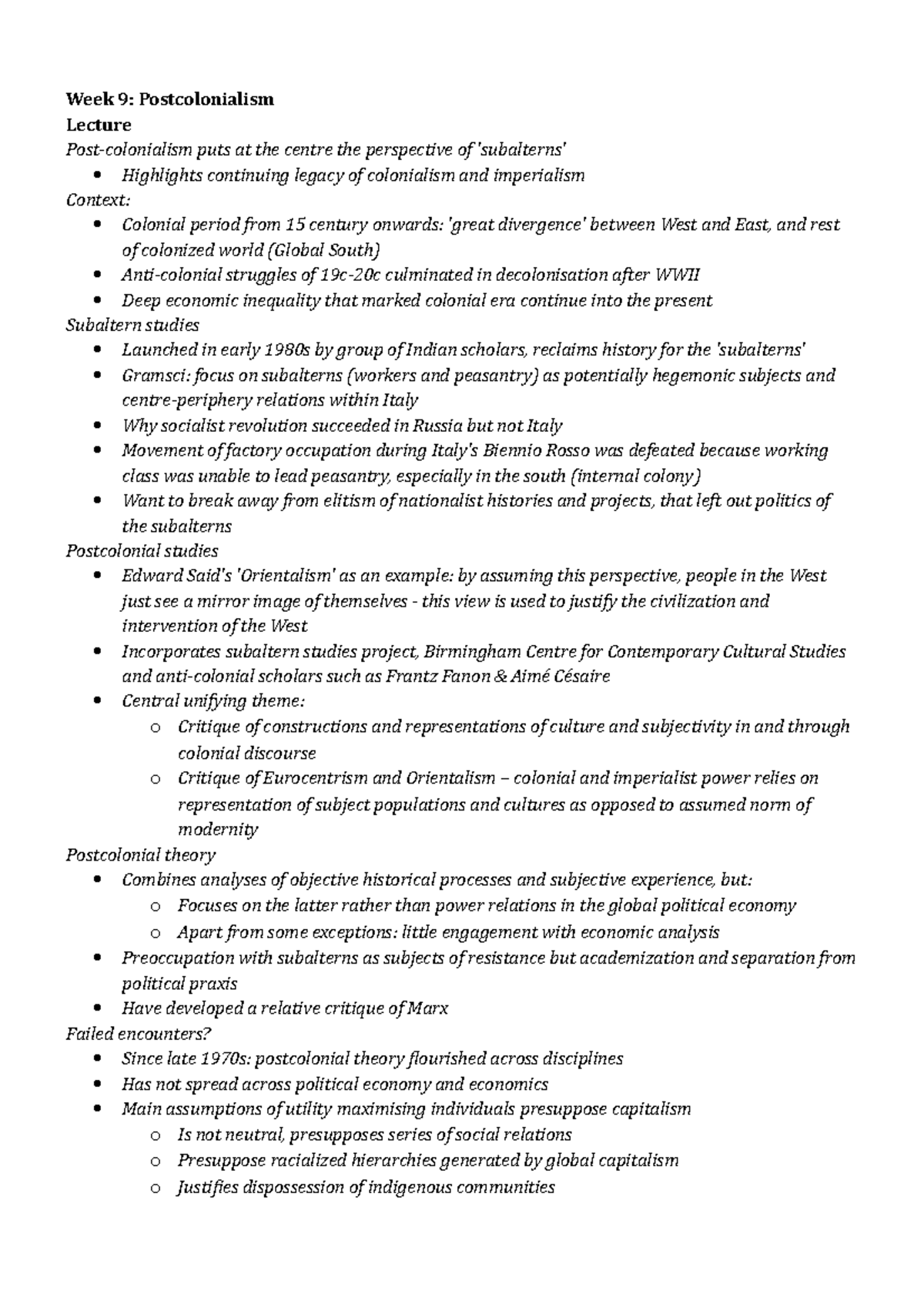PCT - Notes on Colonialism and Post-Colonial Theory - Studocu