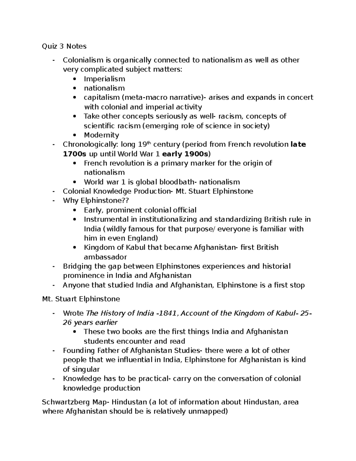 Quiz 3 Notes: Colonialism, Nationalism, and Elphinstone's Legacy - Studocu