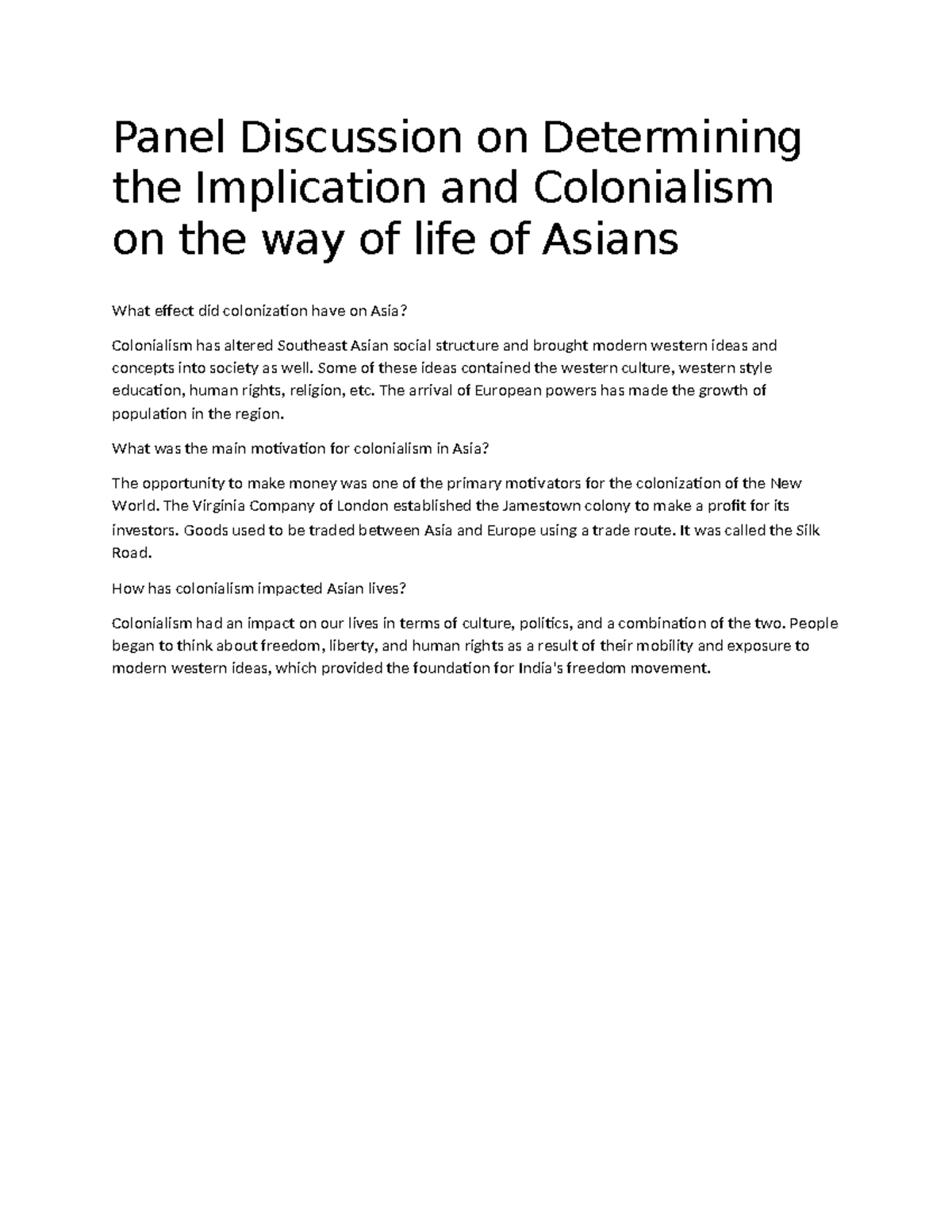 Colonialism's Impact on Asian Lives: A Panel Discussion Analysis - Studocu
