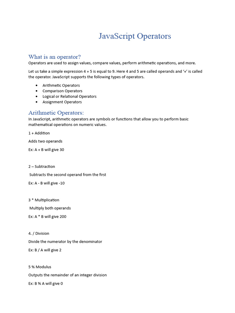 JavaScript Operators | PDF | Arithmetic | Elementary Mathematics