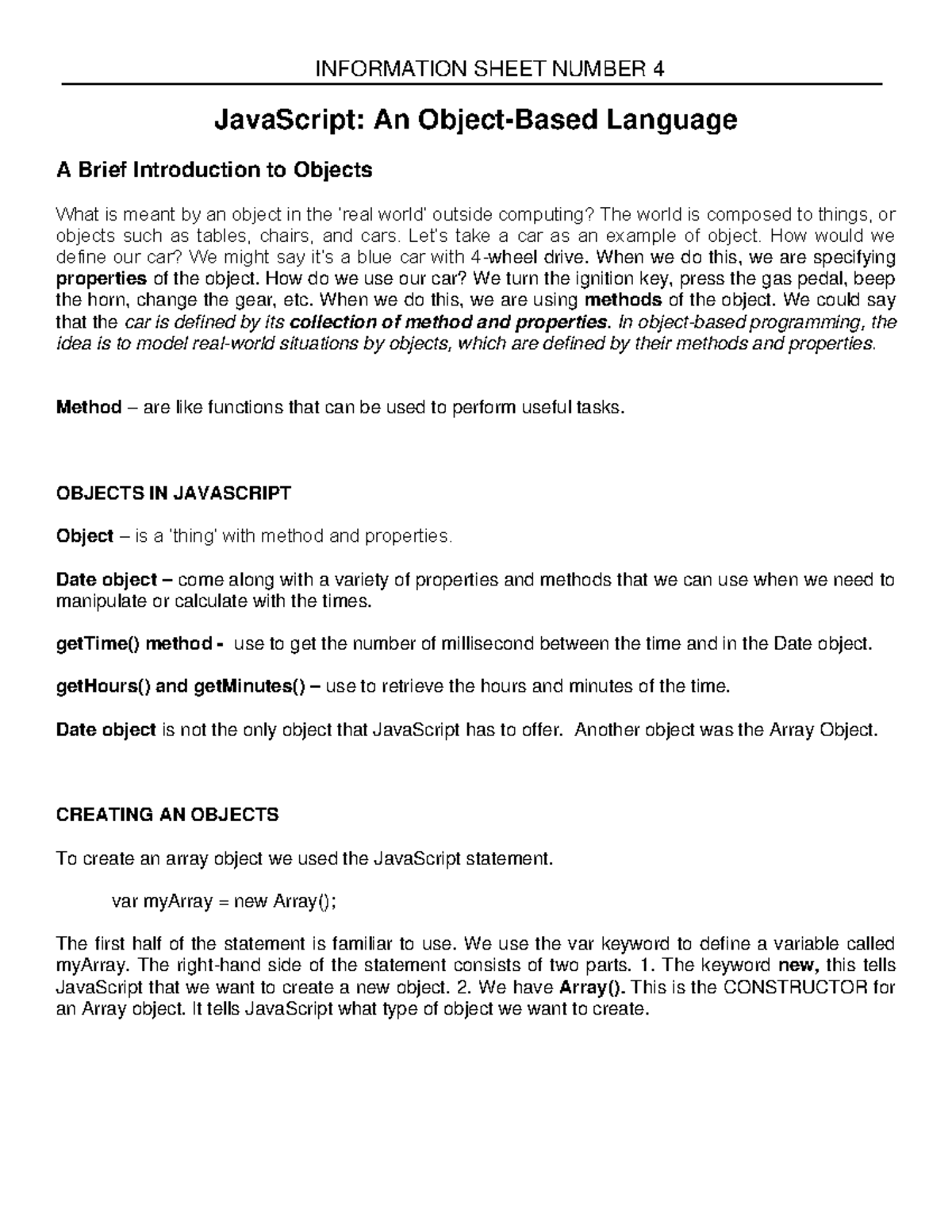 INFO SHEET 4: Intro to JavaScript Objects & Methods - Studocu