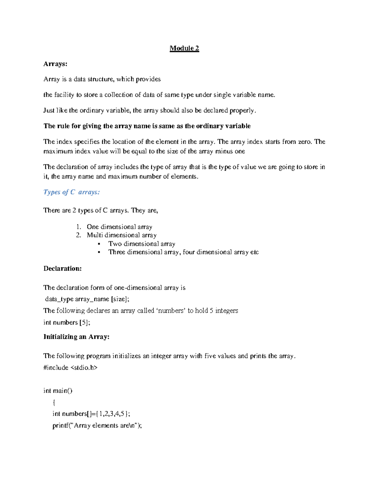 Module 2 Lect2,Lect3,Lect4 - Module 2 Arrays: Array is a data structure ...