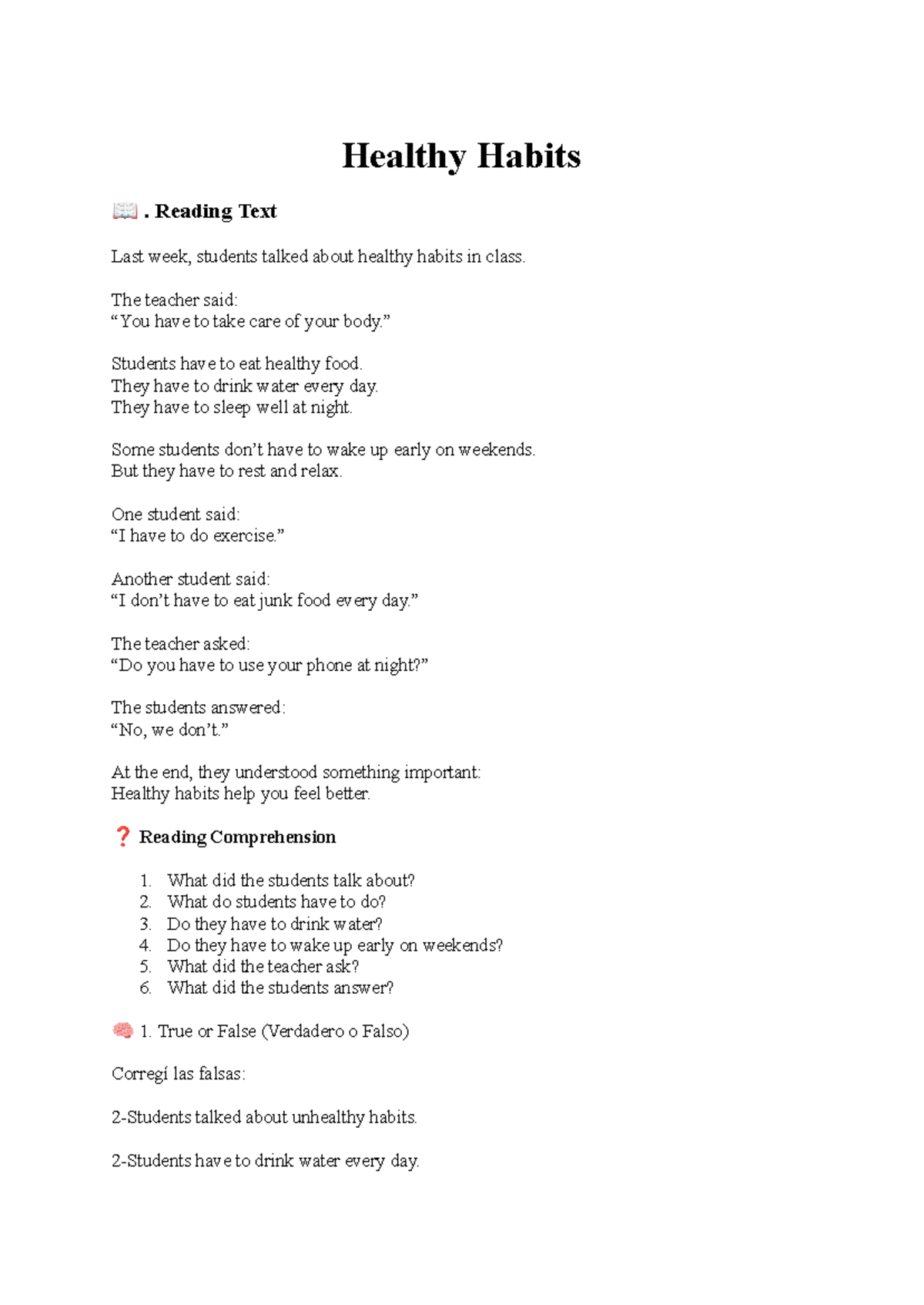 Healthy Habits - Reading Comprehension Notes - Studocu