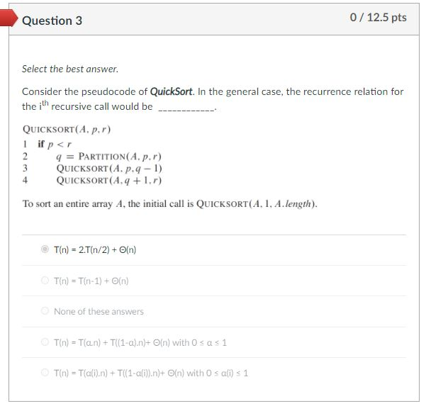 Solved Consider the Quicksort algorithm with the pseudocode | Chegg.com