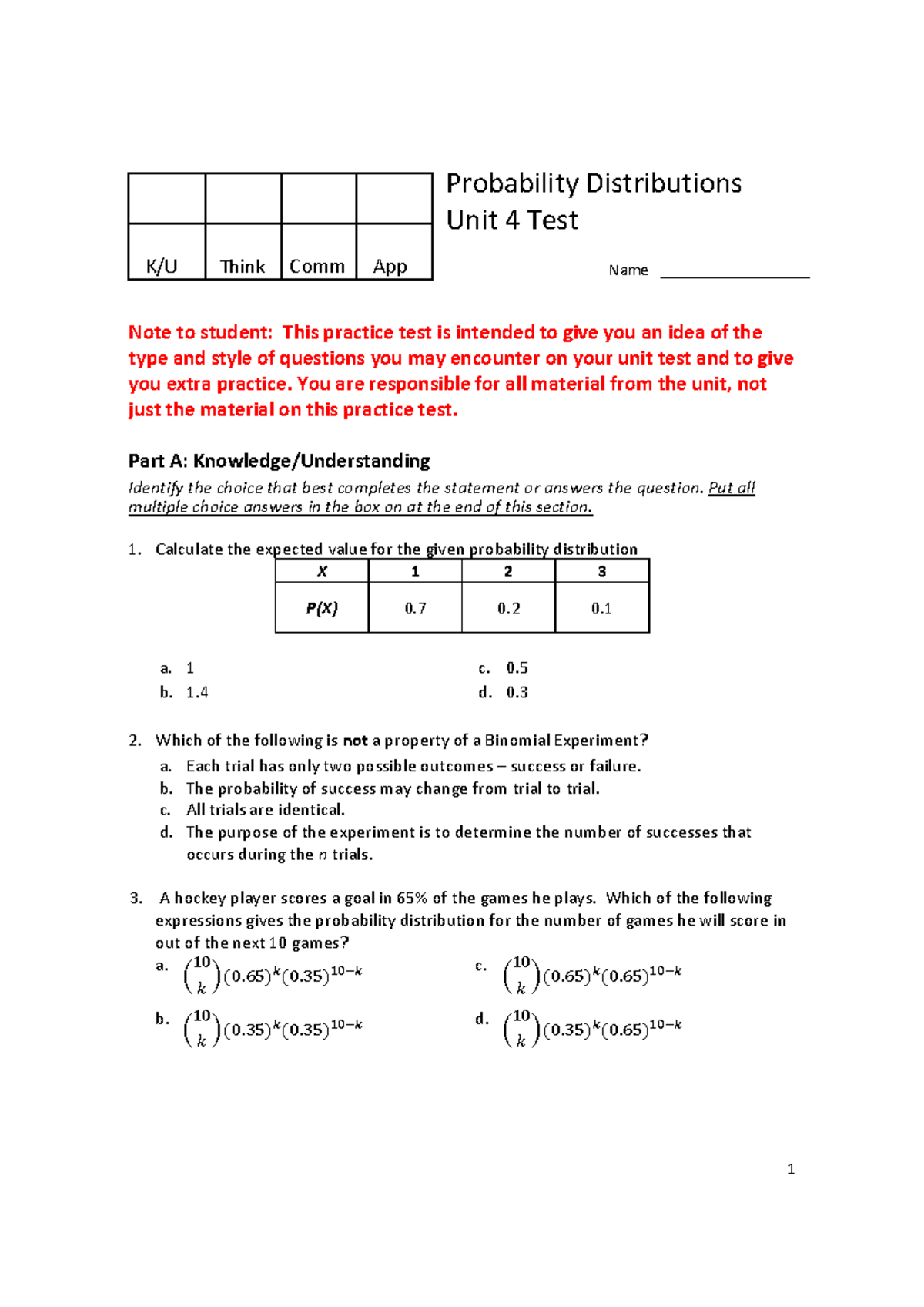 MDM4U - Unit 4 Practice Test: Probability Distributions - Studocu