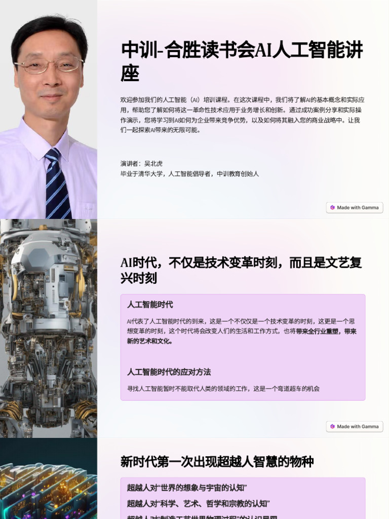 欢迎参加我们的⼈⼯智能(AI)培训课程。在这次课程中,我们将了解AI的基本概念和实际应 ⽤,帮助您了解如何将这⼀⾰命性技术应⽤于业务增⻓和创新 ...
