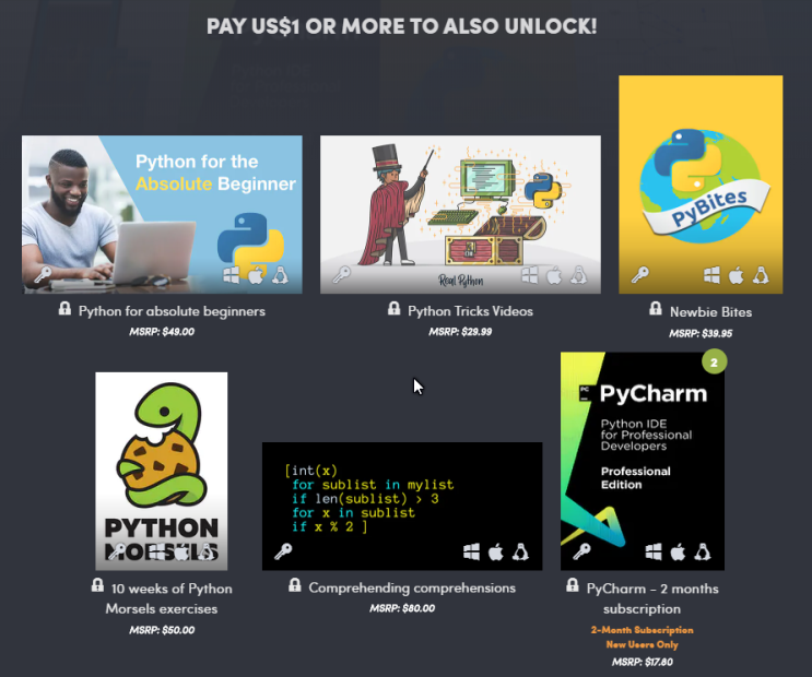 Based on this image's title: “Humble Software Bundle: Learn Python Programming with PyCharm ...”