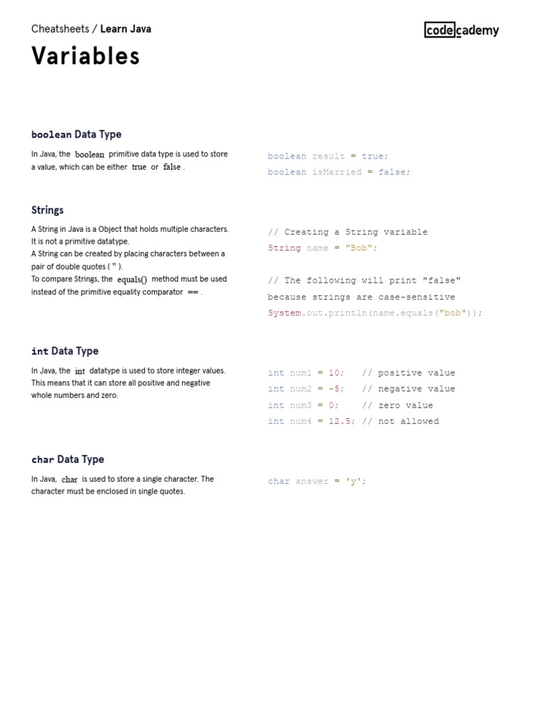 Learn Java_ Variables Cheatsheet _ Codecademy | PDF | Integer (Computer ...