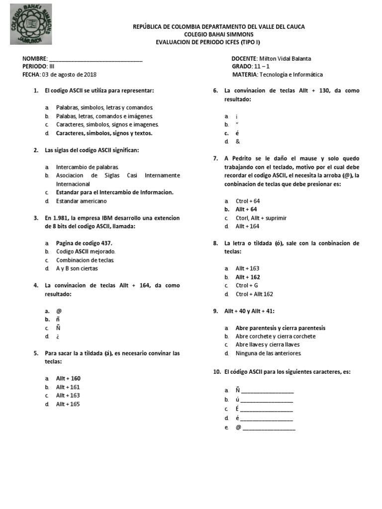 Evaluación sobre Código ASCII y Teclado | PDF | Ascii | Soporte