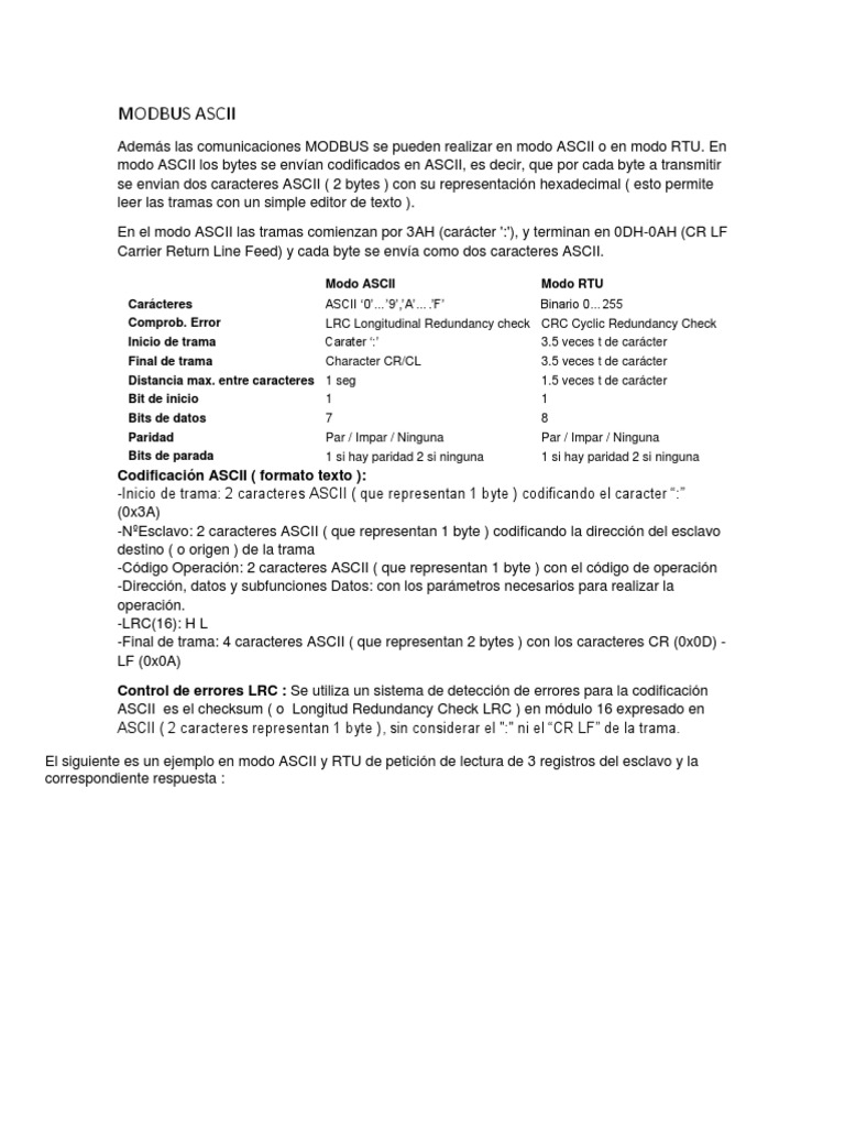 Comunicación MODBUS en modo ASCII | PDF | Ascii | Ingeniería en ...
