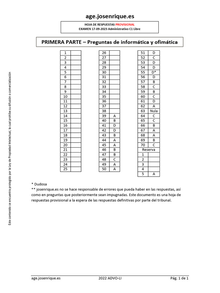 Hoja de Respuestas Examen Administrativo C1 | PDF