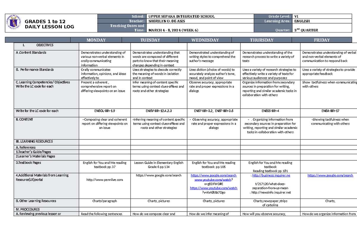 DLL English 6 Q3 W6 - Daily Lesson Log for Grade VI - Studocu