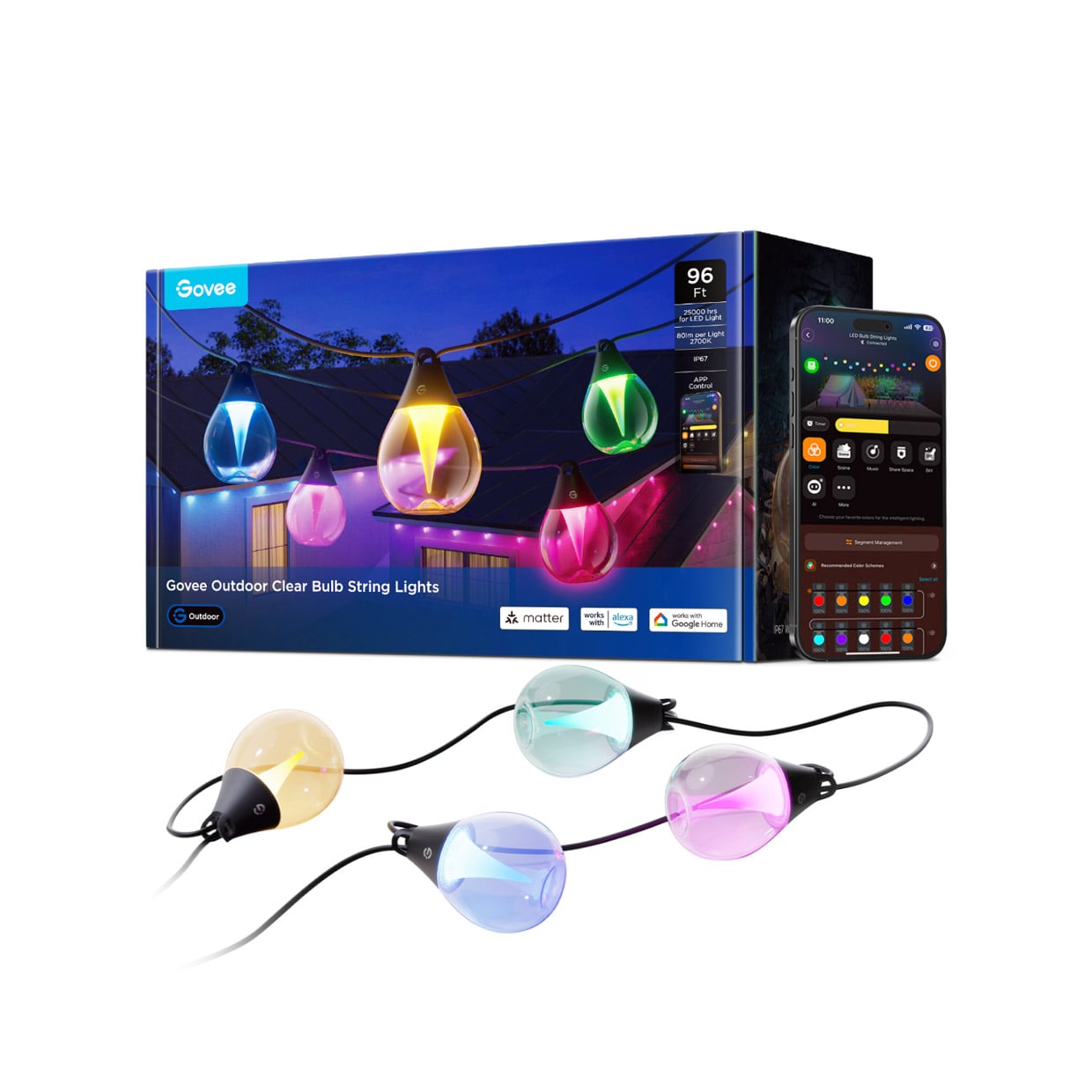 Govee Outdoor Clear Bulb String Lights, 96ft RGBWIC Outdoor String ...