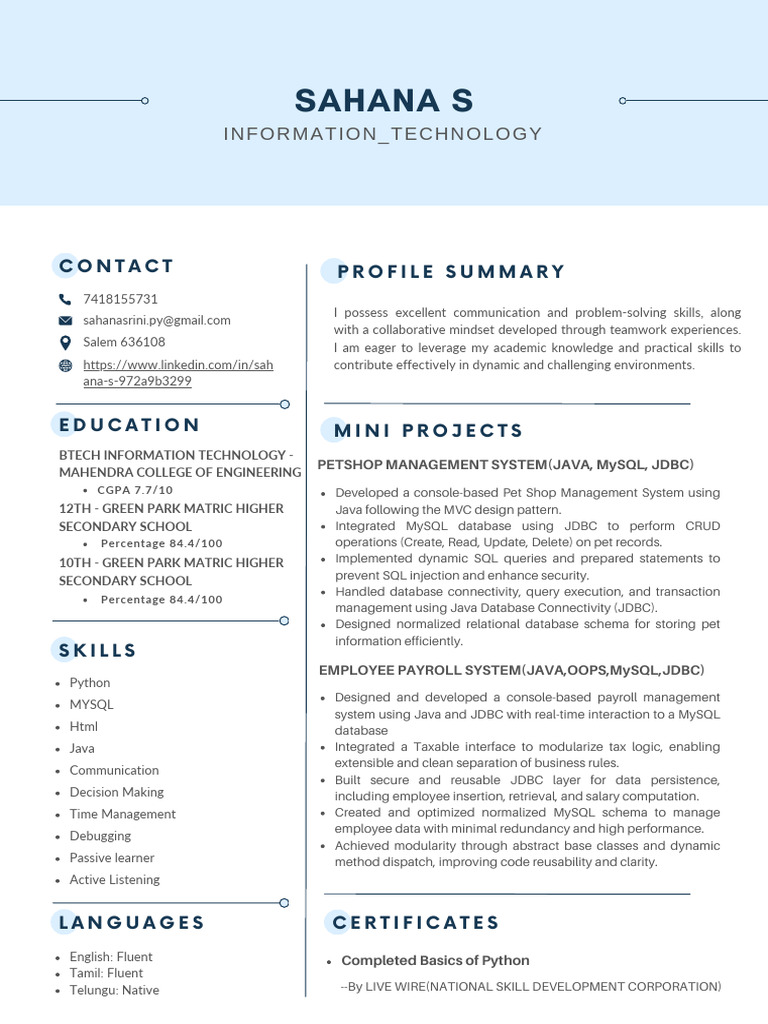Sahana S: IT Graduate & Developer Skills | PDF | Databases | My Sql