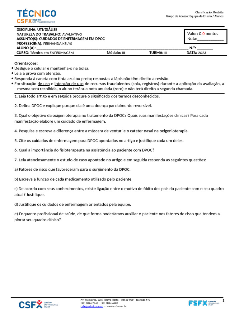 Cuidados de Enfermagem em Dpoc Atividades | PDF | Enfermagem | Doença ...