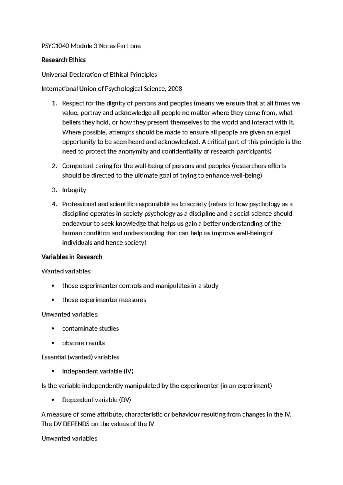 PSYC1040 Module 3 Notes: Research Ethics & Variables Overview - Studocu