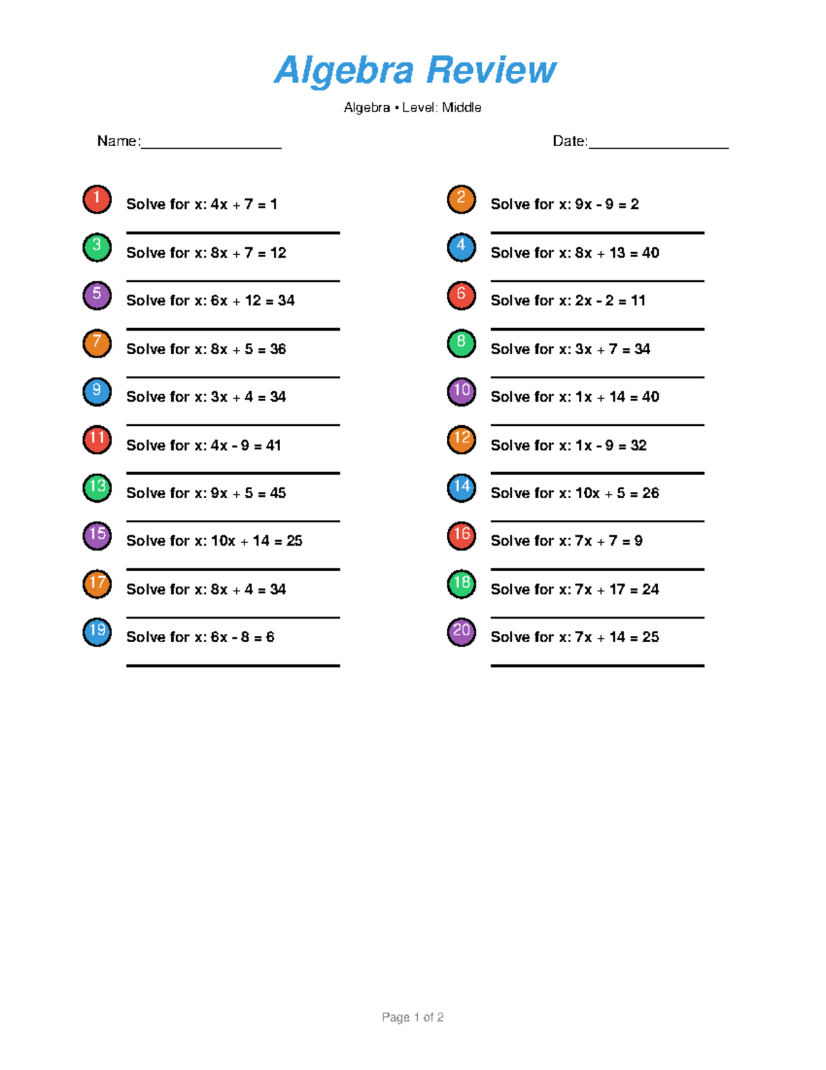Algebra Review: Middle 1 Practice Problems and Solutions - Studocu