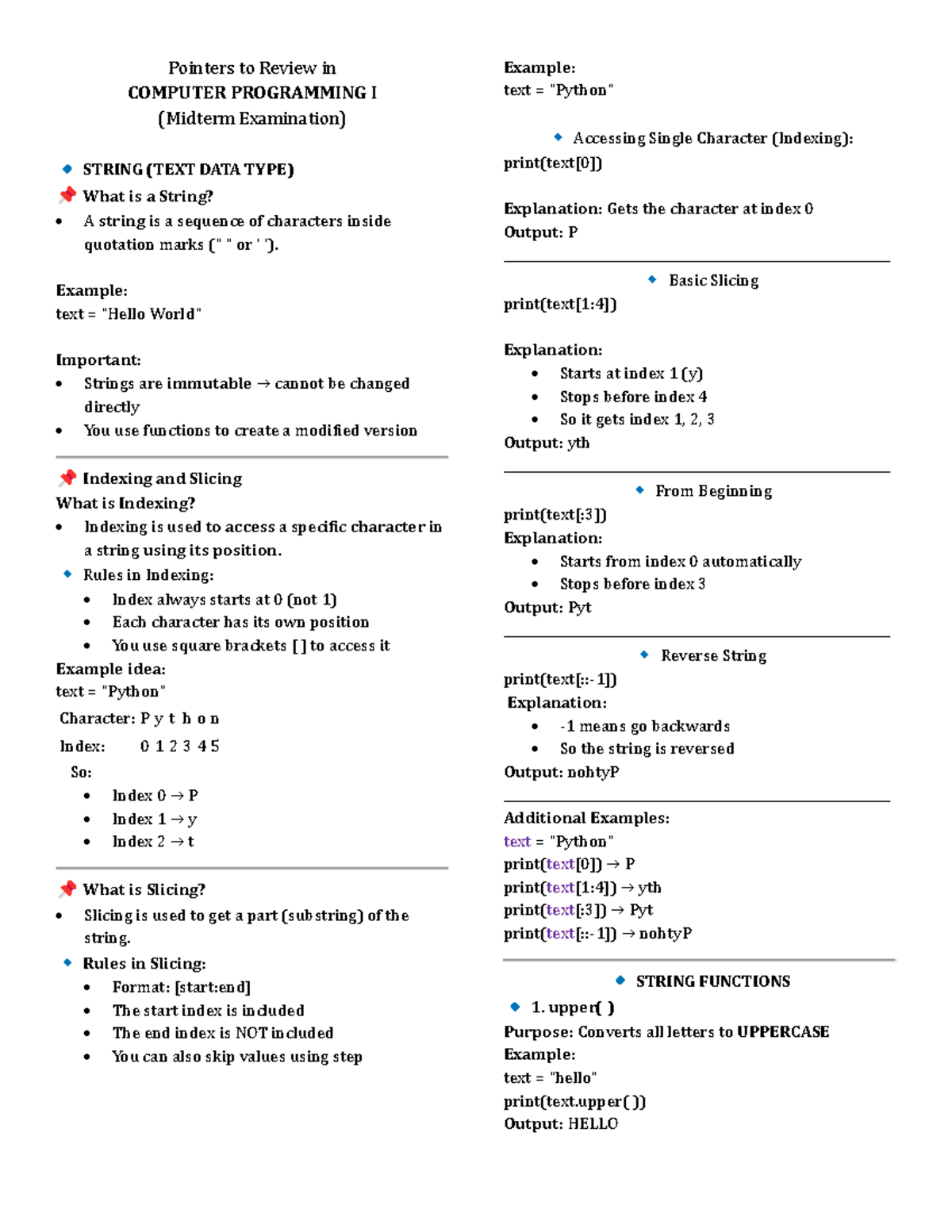 COMPUTER PROGRAMMING I (Midterm Exam) Review: Strings & Functions - Studocu