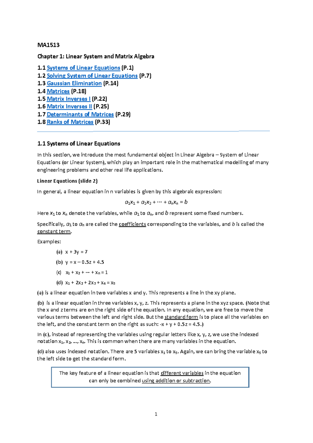 MA1513 Chapter 1: Linear Systems & Matrix Algebra Lecture Notes - Studocu