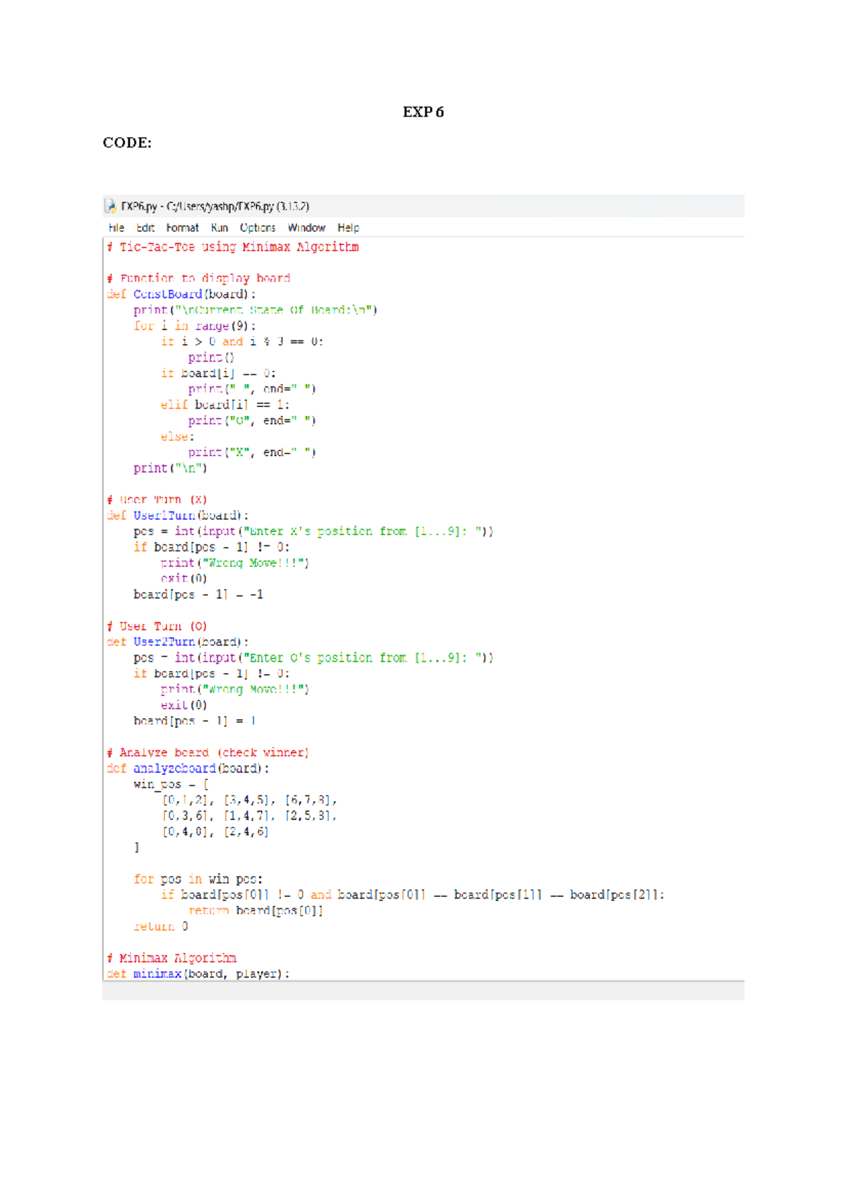 EXP6 - AI Experiment Using Minimax Algorithm in Python - Studocu